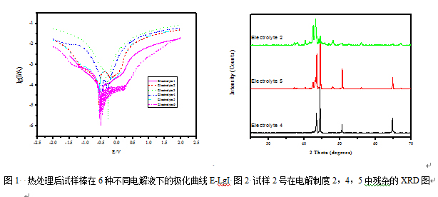 不銹鋼中含有較高的Cr、Ni, 溶液中很容易鈍化, 而且鋼中含有的碳化物及金屬間化合物大都比較穩定, 所以電解液的酸度應該比較大, 活性離子含量也應較高, 在水溶液中進行電解是比較困難的,如果用醇做溶劑, 對基體活化溶解的效果更好,同時可以抑制一些相的水副反應的發生,并使電解后的表面光滑,從而減少損失,便于洗滌。試驗首先考查了試樣棒2號在六種不同電解制度下(電解液不同,但均以醇為溶劑)的極化曲線(圖1)。即利用析出相與基體在電解液中穩定電位的差別,外加電流使試樣極化,當極化條件合適(即電極電位介于基體的穩定電位與析出相穩定電位之間),合金基體以一定的速度電解,目的相則以不溶性殘渣的形式被提取出來。圖1顯示腐蝕電流從大到小分別為電解制度4-5-2-6-1-3。因此,電解制度6,1,3的電解速度相對要慢。電解效果也證明了2205雙相不銹鋼在電解制度2,4,5中的電解效果比較好。而電解制度3和6的均出現明顯的點蝕現象。